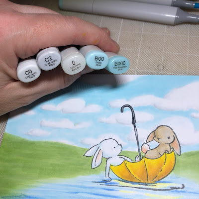 As you have seen in my pictures, the yellow has bled in to the other bunny. With my colorless blender I pushed that colour back. And I wanted this bunny bright white so I chose a blue colour for my mid-tone and a cool grey as the shadow colour. I blend the mid-tone for a nice shading from blue to white.